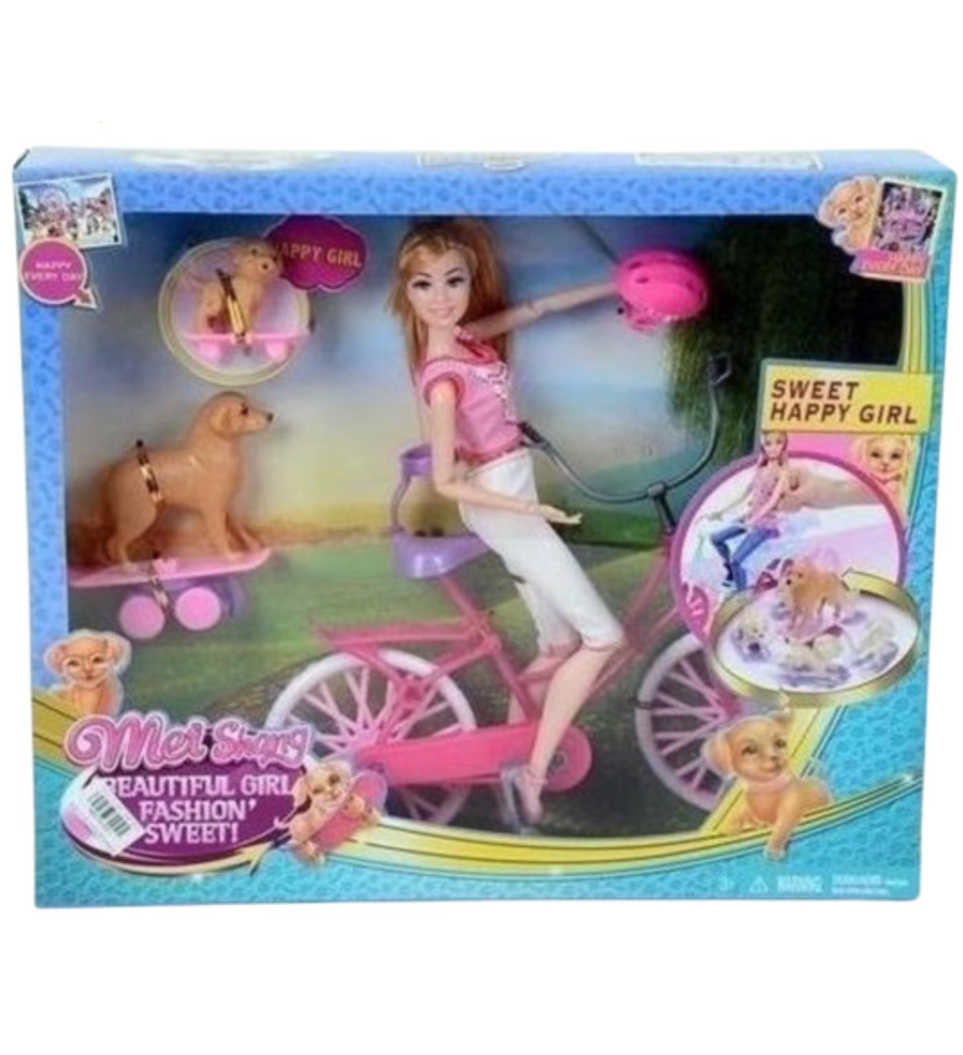 Muñeca Articulada en Bici con 2 perros en caja 40x33x9cm