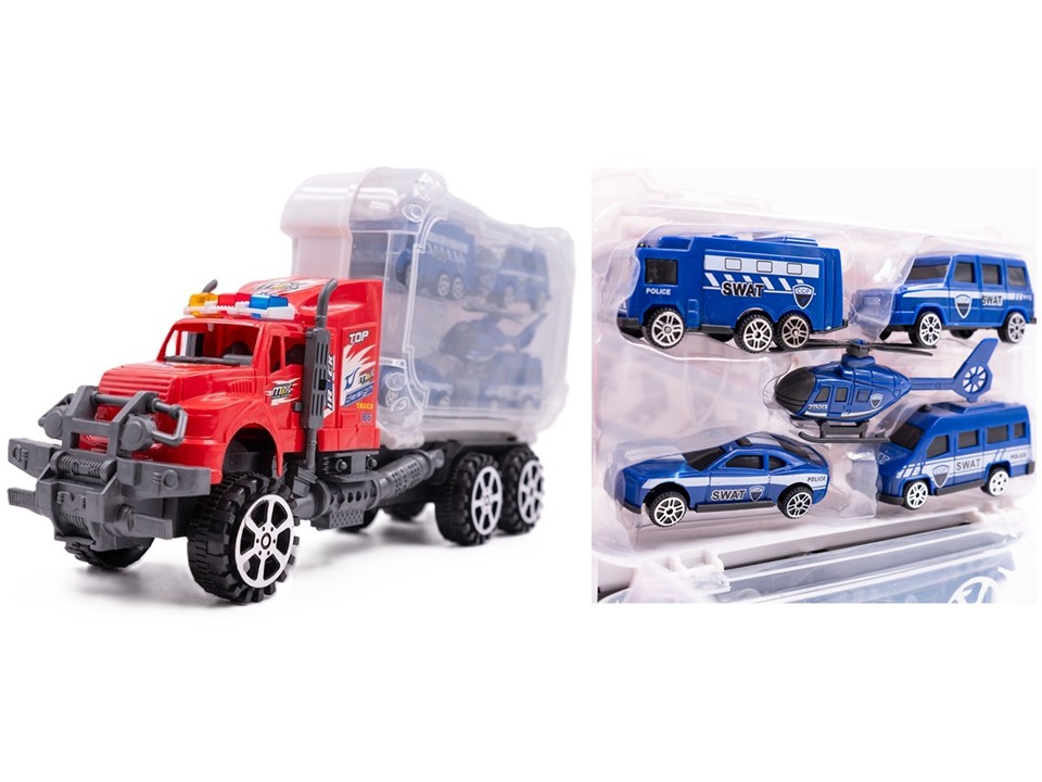 Camion a friccion con autos linea Swat en caja 34x20x10cm